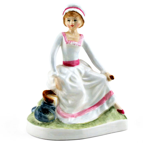 NEW IN BOX Royal Doulton figurine Little Miss Muffet HN2727 was designed by William K. Harper in 1984 and was in production until 1987. She stands 6.25 inches tall and is bone china hand painted in England. She is one of the Nursery Rhymes Series 2.