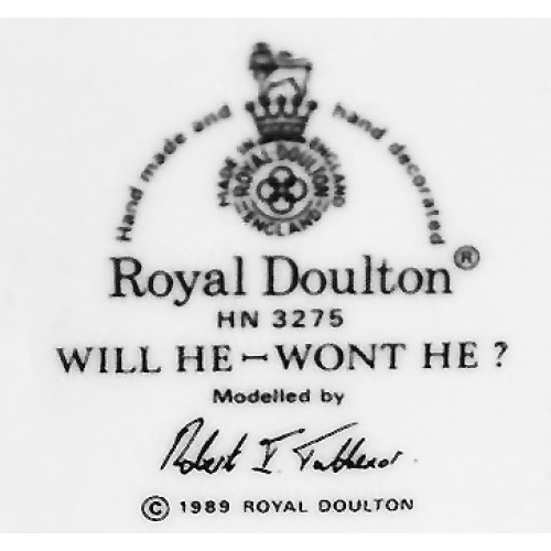 NEW IN BOX Royal Doulton figurine Will He Wont He HN 3275 designed by Robert Tabbenor in 1990 and in production until 1994, He is one of the Clown series, bone china hand painted in England. He stands 9 inhes tall