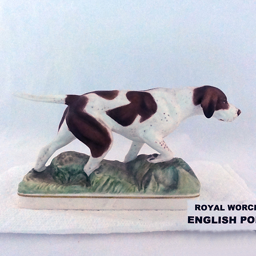 NEW NEVER SOLD Royal Worcester figurine English Pointer is one of the Sporting Dogs series, designed by Doris Lindner it is 8 inches long, 4.5 inches high and 2 inches wide, somes with a plinth and is a limited edition, bone china hand painted in England, made in 1975