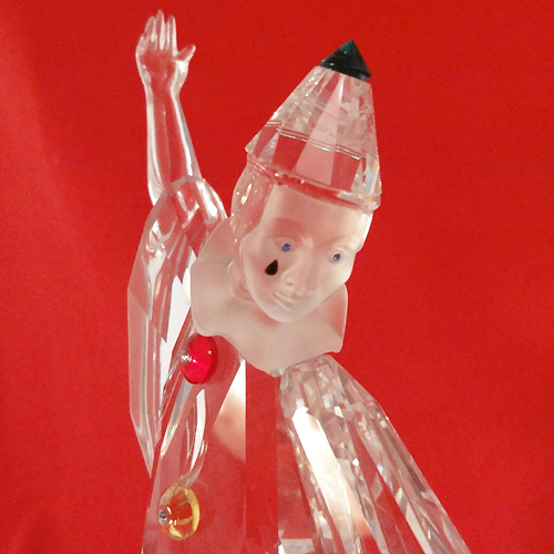 NEW IN BOX Swarovski crystal Pierrot SCS Annual Edition 1999 with stand and plaque, it was designed by Adi Stocker and is the First edition of the Masquarade Trilogy, he is the first of the human figures in the Swarovski Collection and is the first to have coloured additions, he stands 8 inches tall and 5 inches wide, he is silver crystal made in Austria