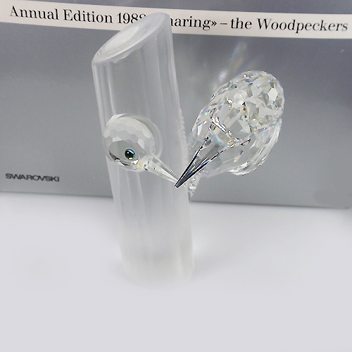 NEW IN BOX Swarovski crystal figurine Woodpeckers 1988 SCS edition 4.25" tall, designed by Adi Stocker, 2nd edition of the Sharing and Caring Series, one of the Swarovski Collectors Society pieces, hand etched with swan insignia, silver crystal made in Austria