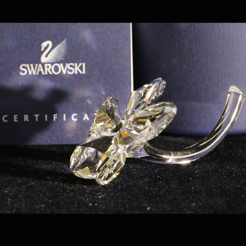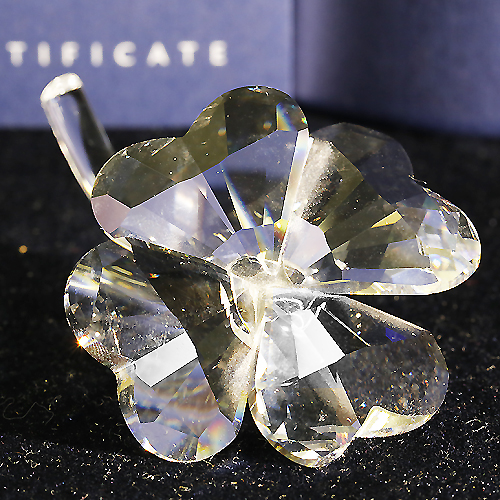 NEW IN BOX Swarovski Four Leaf Clover 212101 is hand cut silver crystal ,hand assembled and made in Austria. It is in perfect condition and comes with box and certificate. It stands 1.25inch in height and 1.5 inches wide