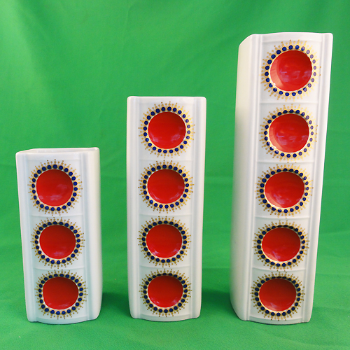 NEW NEVER USED Schumann Arzberg Vase 3 Red discs 7.25" tall, porcelain circa 1950, porcelain made in Bavaria Germany, Bauhaus desigsn, there are 3 sizes on this site that can be used together