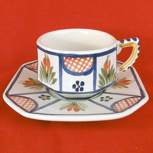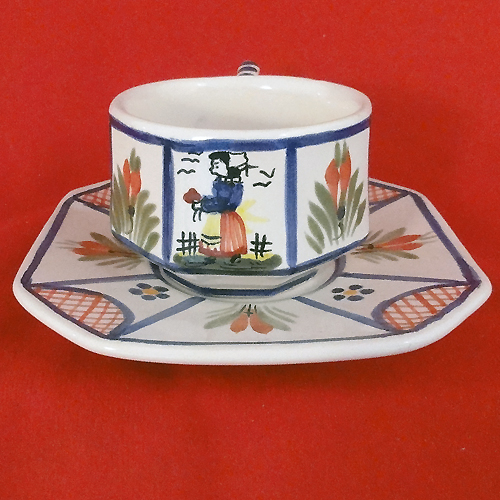 Quimper Cup & Saucer Hexagon Lady Yellow Apron red lattice