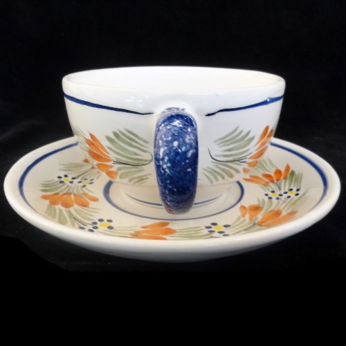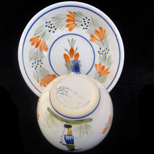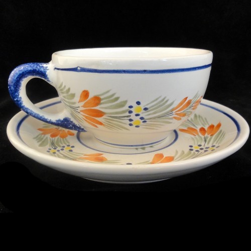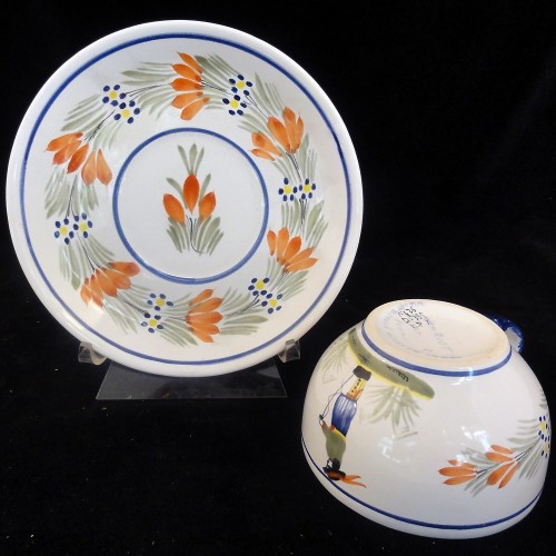 NEW NEVER USED Quimper dinnerware Cup & Saucer ROUND man with staff, yellow flower, orange flower, blue handle, is hand painted by the Faiencer Henroit in Brittany France. Quimper town has been producing Faience pottery for over 300 years.