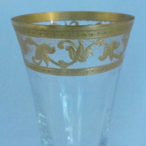NEW NEVER USED Saint Louis crystal stemware Callot created for the Nancy Exhibition of 1908, this Claret Number 4, is 5.75 inches tall, 3.75 inches dimeter at the lip, manufactured in France, it is the oldest crystal manufacturer in Europe founded in 1586 in eastern France, mouth blown, and hand cut and etched the gold is applied by hand after the crystal has been etched in relief and then the glass is refired so the gold melds with the crystal and becomes one, it will never wear off, Crystal providor to Kings of Europe