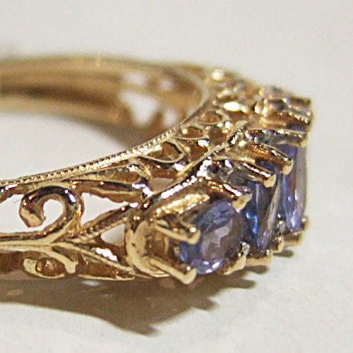 Here is a Tanzenite ladies 14kt yellow gold ring. It has 5 full cut stones set in an antique style cuttle fish setting