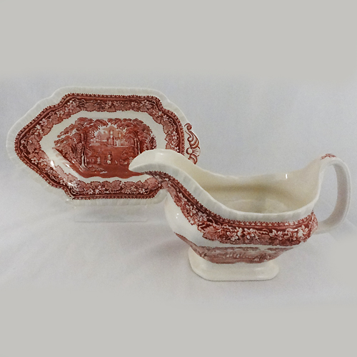 NEW NEVER USED Masons Ironstone Vitreous Porcelain dinnerware Pink Vista Gravy Boat 4 inches tall and 7.5 inches long and 3.25 inches wide, Stand is 8.25 inches long and 5.25 inches wide, transfer print, detergent proof and acid resistant colours made in England
