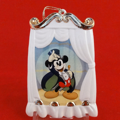 NEW NEVER SOLD Disney ornament Magician Mickey On with the Show is porcelain and is one of the Collectors Society Ornaments.It is porcelain, 1.25 inches high, 5.5 inches long and 4.25 inches wide,1997