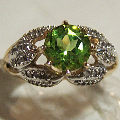 Peridot ladies ring. It has a full cut round centre stone. This ring is 10kt gold and is surrounded on both sides with diamonds. It is made by Farsi if Los Angeles