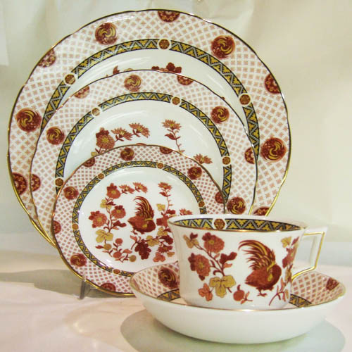 New Never Used Wedgwood Golden Cockerel 5 Piece Place Setting, Dinner 11" diameter, Salad 8.25", Bread & Butter 6.25", Cup & Saucer, Bone China 24kt Gold trim, made in England